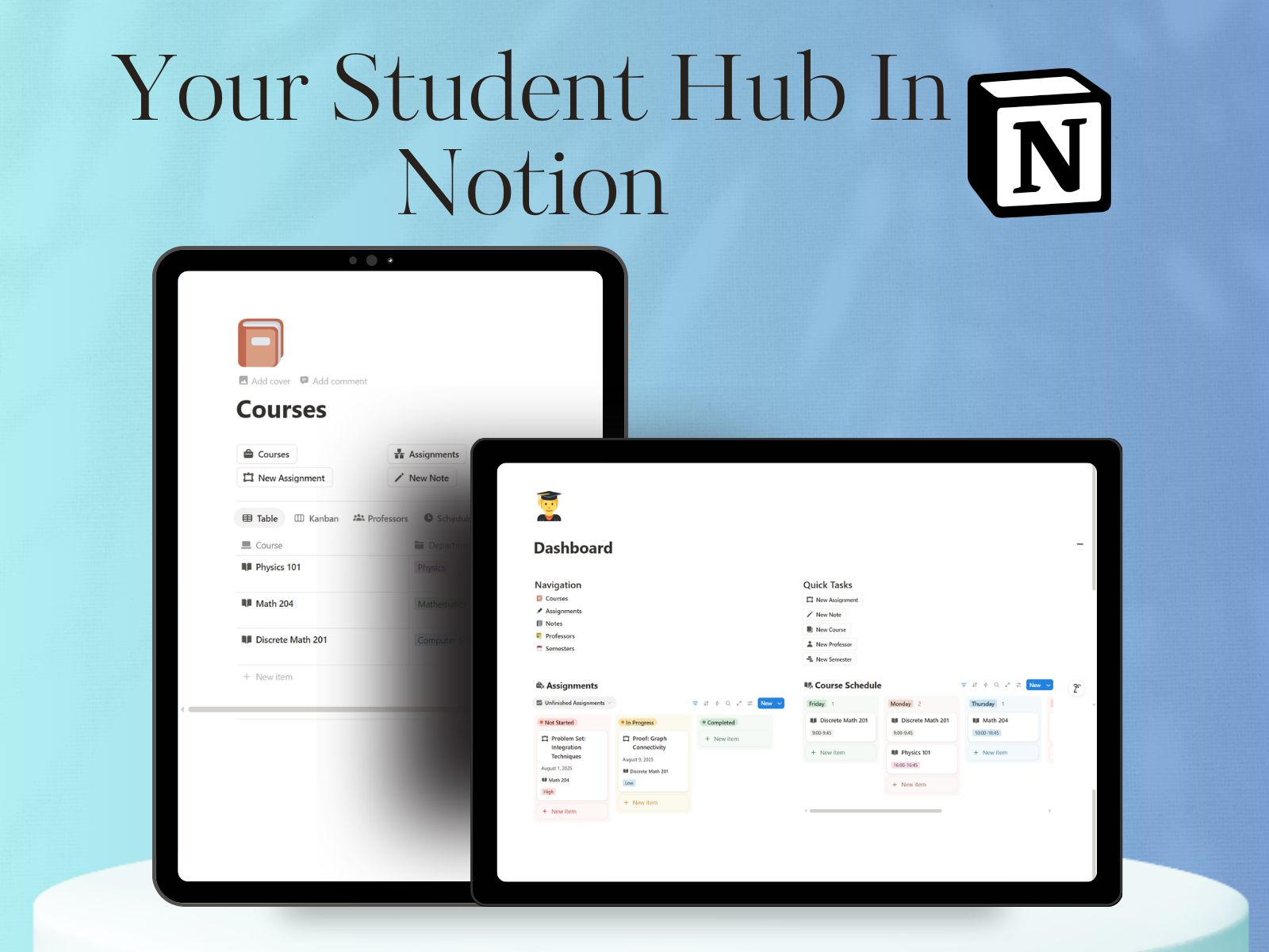 Academic Dashboard Template: A comprehensive student organizer featuring course management, assignment tracking with calendar integration, lecture note system, professor directory with contact details, semester planning, Kanban task boards, progress analytics, and quick-action tools for efficient academic workflow. Key elements covered: Core modules (Courses, Assignments, Notes, Professors, Semesters)Key features (Calendar integration, Kanban boards, Progress analytics)Organization systems (Note categorization, Course scheduling, Assignment tracking)Practical tools (Professor directory, Quick-action buttons)User benefits (Efficient workflow, Comprehensive organization)