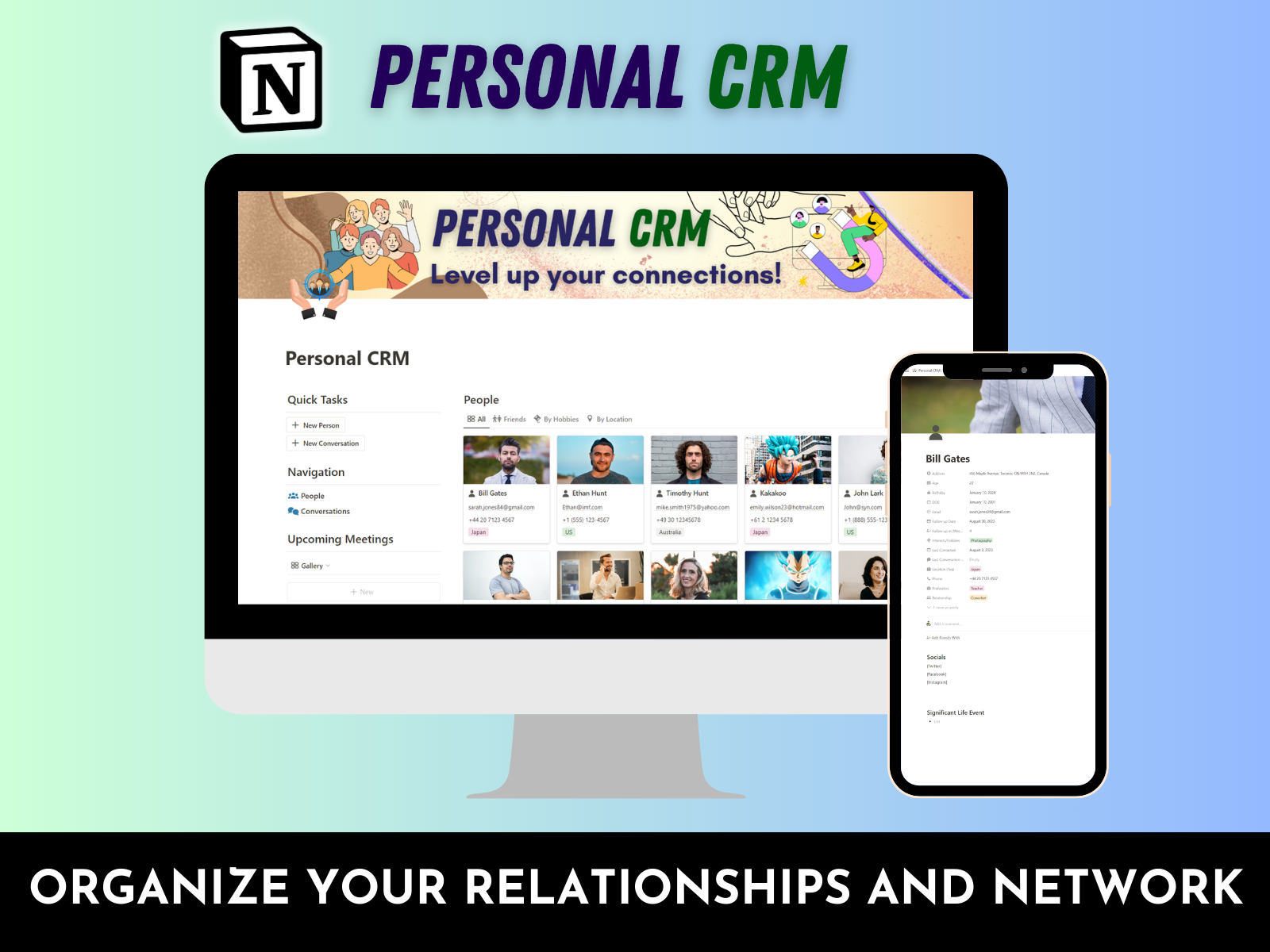 The Personal CRM Template is a transformative solution designed to elevate the way you manage and nurture your valuable relationships. With this all-inclusive template, you can effortlessly organize and maintain a comprehensive record of your contacts, interactions, and important details in one centralized hub. Bid farewell to missed opportunities and disconnected communication. The Personal CRM Template empowers you to cultivate meaningful connections, track engagements, and stay top-of-mind with your network. Seamlessly navigate through your contacts, schedule follow-ups, and prioritize your relationship-building efforts. Frequently Asked Questions (FAQ) What is a Personal CRM? A Personal CRM is a system and approach for efficiently managing and nurturing your relationships. It serves as a hub for tracking contacts, interactions, and important notes, allowing you to foster meaningful connections and stay organized in your networking efforts.How can the Personal CRM Template benefit me? The Personal CRM Template provides a structured framework to help you build and cultivate your personal network. It offers a centralized space where you can effortlessly manage your contacts, log interactions, and prioritize follow-ups. This empowers you to enhance your networking capabilities and establish authentic relationships.Is the Personal CRM Template customizable? Absolutely! The Personal CRM Template is designed to be adaptable to your specific needs. You can easily customize it by adding fields, modifying sections, and tailoring it to align with your unique networking style and preferences.Can I access the Personal CRM Template on various devices? Yes, the Personal CRM Template is crafted within Notion, a versatile cross-platform application accessible on web browsers, desktops, and mobile devices. This ensures you can seamlessly manage your relationships across multiple devices, guaranteeing easy access whenever and wherever you need it.How will the Personal CRM Template enhance my organization? The Personal CRM Template offers dedicated sections for contacts, interactions, notes, follow-ups, and more. By utilizing these segments, you can efficiently categorize and retrieve information, keep track of your engagements, and maintain a well-organized relational space.Can I collaborate with others using the Personal CRM Template? While the current version of the Personal CRM Template is intended for individual use, we are exploring future options for collaborative features. Stay tuned for updates on enhancements to support team-oriented networking.Do I need prior experience with Notion to use the Personal CRM Template? While familiarity with Notion can be helpful, the Personal CRM Template is designed to be user-friendly and accessible for all levels of users. Whether you're new to Notion or an experienced user, you'll find the template intuitive to navigate and adapt to your preferences.Is customer support available for the Personal CRM Template? Yes, as a valued user, you'll have access to dedicated customer support for any inquiries, concerns, or guidance you may require while utilizing the Personal CRM Template. We're committed to ensuring your networking experience is smooth and successful. Don't find your question answered here? Feel free to reach out via email or connect with me on Twitter, and I'll be delighted to assist you!