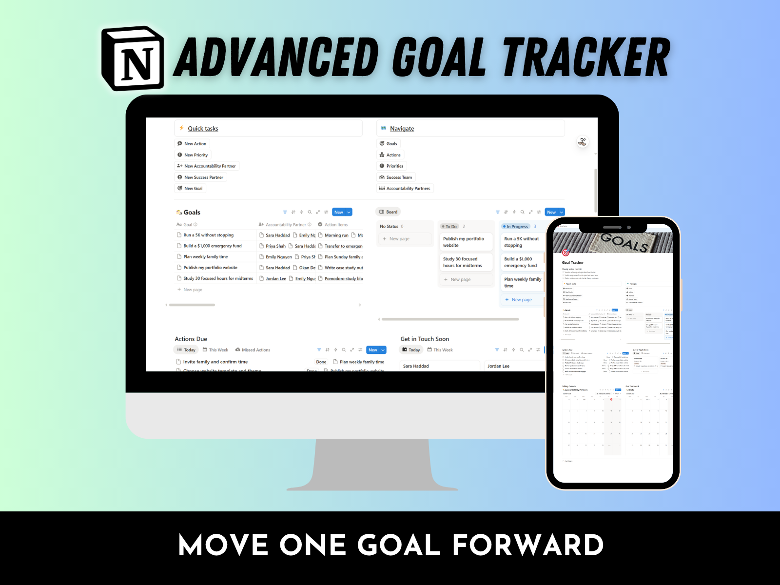 A focused personal goals and habits hub with weekly reviews, quick actions, due views, and accountability, keeping your top priorities moving.