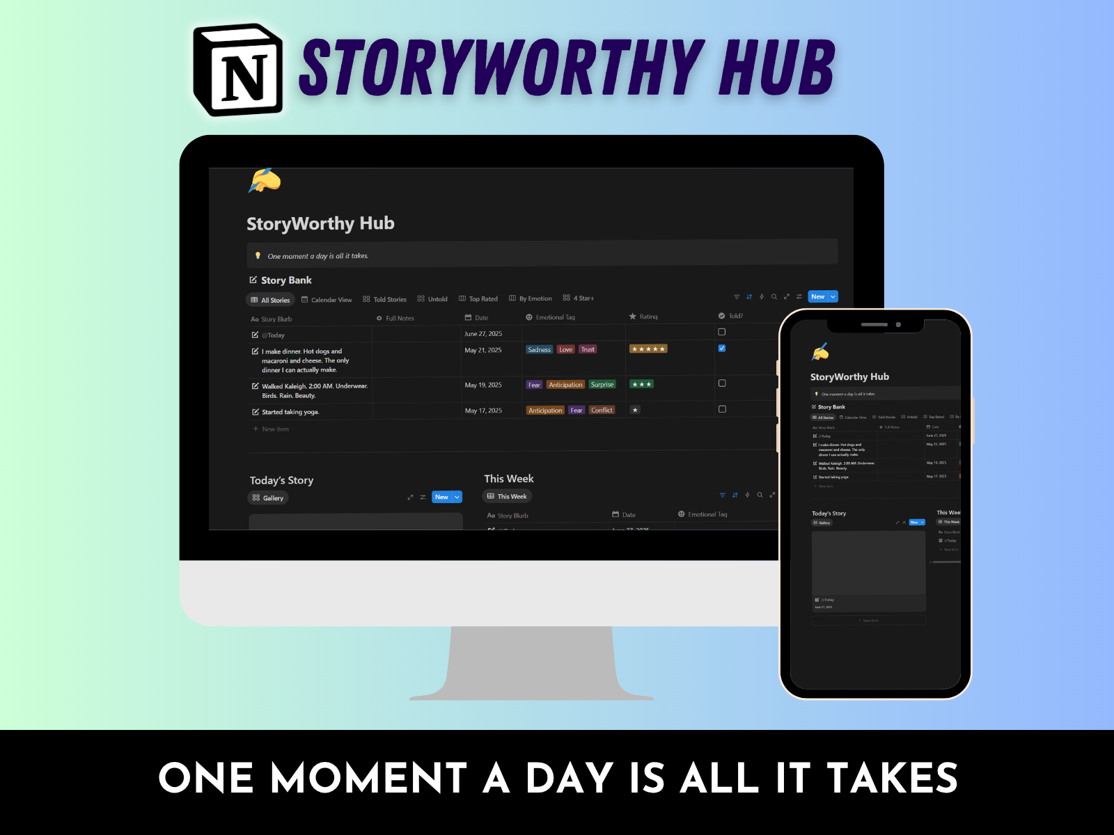 StoryWorthy Hub: Turn every day into story fuel Capture one meaningful moment a day, bank a lifetime of stories. Inspired by Matthew Dicks’ Storyworthy method, this Notion hub streamlines “Homework for Life" database system that runs itself on the free Notion plan. Never lose a gem: Your daily page is waiting when you wake up; just open and type one line. Try it for free