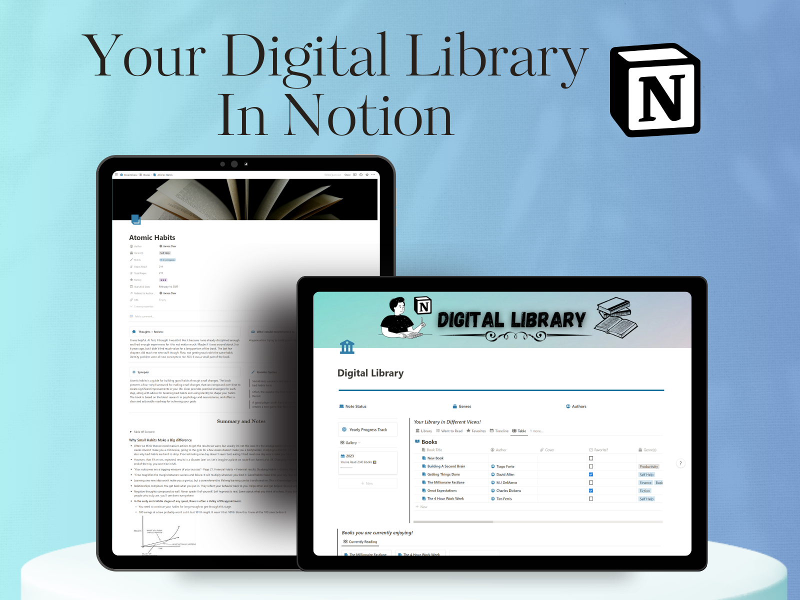 A comprehensive solution for book lovers to organize, track, and engage with their reading journey. Whether you're an avid reader, student, or simply seeking a streamlined way to manage your book collection, the Notion Digital Library offers a versatile platform with a range of features to enhance your reading experience.The Notion Digital Library is your ultimate companion for managing your book collection and tracking your reading progress. With its intuitive interface and powerful features, you can effortlessly organize your books, keep track of reading milestones, and delve into a world of literary exploration. From tracking your yearly progress to capturing book notes and accessing important details about each book, the Notion Digital Library provides a seamless reading experience tailored to your needsKey Features Yearly Progress TrackerBook Notes Template and StatusImportant Book DetailsReading Progress TrackerMultiple Viewsand more! Get ready to revolutionize your reading experience with the Notion Digital Library. Streamline your book management, track your progress, and discover new literary adventures. Unleash the power of your personal library today! Don't see your question here? Feel free to reach out via email or DM me via Twitter and I'll be happy to assist you!