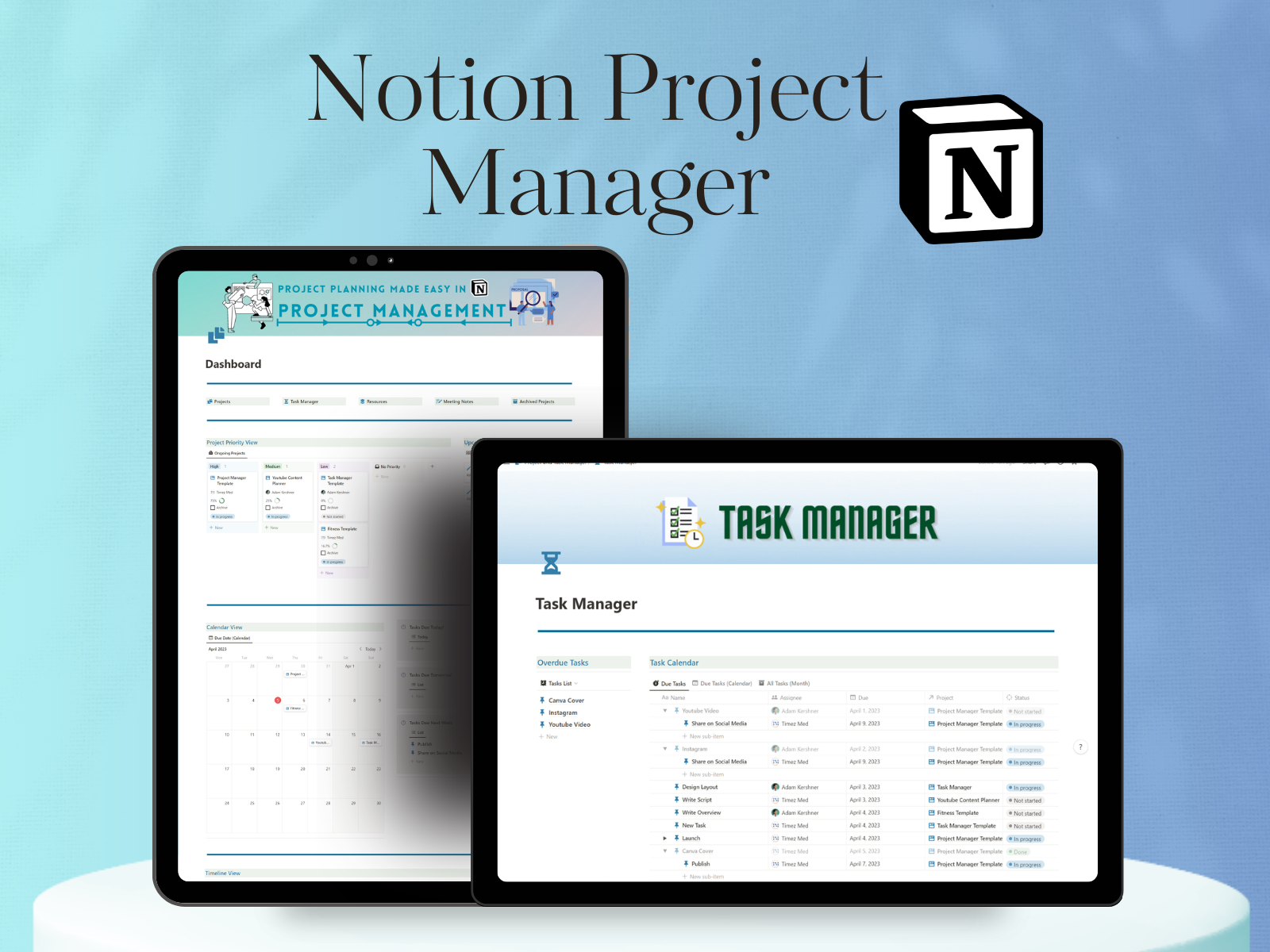 Introducing the Project Manager Template, the ultimate solution to streamline your project management process. With six powerful databases, including Projects, Tasks, Resources, Archive, Clients, and Meeting Notes, this template empowers you to stay organized, collaborate effectively, and achieve project success. From project details to tasks, meeting notes, and more, everything you need to manage your project is at your fingertips. More info Key Features Comprehensive Databases: Benefit from six essential databases, including Projects, Tasks, Resources, Archive, Clients(CRM), and Meeting Notes, to efficiently organize and access all project-related information in one place.Default Template Pages: Each project in the Projects database comes with a pre-designed template page, offering a complete view of the project, including essential project information such as overview, task lists, resources, and more.Dynamic Dashboard: Gain valuable insights with the interactive dashboard featuring ongoing projects, a calendar view of projects, tasks categorized by due dates, upcoming meetings, a project timeline for visualizing project milestones, and more.Robust Task Manager: Utilize the powerful task manager to assign tasks, set due dates, track progress, and collaborate with team members, ensuring seamless task execution and efficient project management.Collaborative Workspace: Enable team-based collaboration by leveraging the Meeting Notes database to capture important discussions, decisions, and action items during project meetings, fostering effective communication and alignment.Clients Database: Effectively manage client information, interactions, and project-specific details using the dedicated Clients database, ensuring smooth client relationships and streamlined project workflows. Frequently Asked Questions (FAQ) How can the Project Manager Template help me stay organized and focused? The Project Manager Template provides a centralized hub for all your project-related information. From tasks and resources to meeting notes and project timelines, the template ensures you have everything you need in one place. Stay organized, track progress, and achieve your project goals efficiently.Is the Project Manager Template suitable for both individual and team use? Absolutely! The Project Manager Template is designed to cater to both individual project management needs and team collaboration. Whether you're managing personal projects or working with a team, the template offers the flexibility and functionality to adapt to your specific requirements.Can I track project milestones and deadlines using the Project Manager Template? Yes! The template includes features such as project timelines and task due dates, allowing you to track project milestones and deadlines effectively. Visualize your project progress, stay on top of important dates, and ensure timely completion of tasks.How does the Project Manager Template support resource management? With the Resources database in the template, you can easily organize and access project-related resources such as documents, files, and links. Keep all your essential resources at your fingertips, saving time and streamlining your workflow.Can I customize the Project Manager Template to fit my specific project management workflow? Absolutely! The template is highly customizable, allowing you to adapt it to your unique project management needs. Add custom fields, create personalized views, and tailor the template to align with your preferred workflow, ensuring a seamless project management experience. Don't see your question here? Feel free to reach out via email or DM me via Twitter and I'll be happy to assist you!