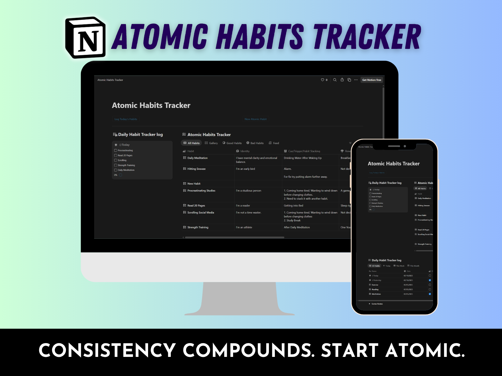 A minimalist Notion template inspired by James Clear’s Atomic Habits. Track daily habits, reinforce identity-based goals, and visualize progress with integrated logs for good/bad habits—all in one streamlined workspace.
