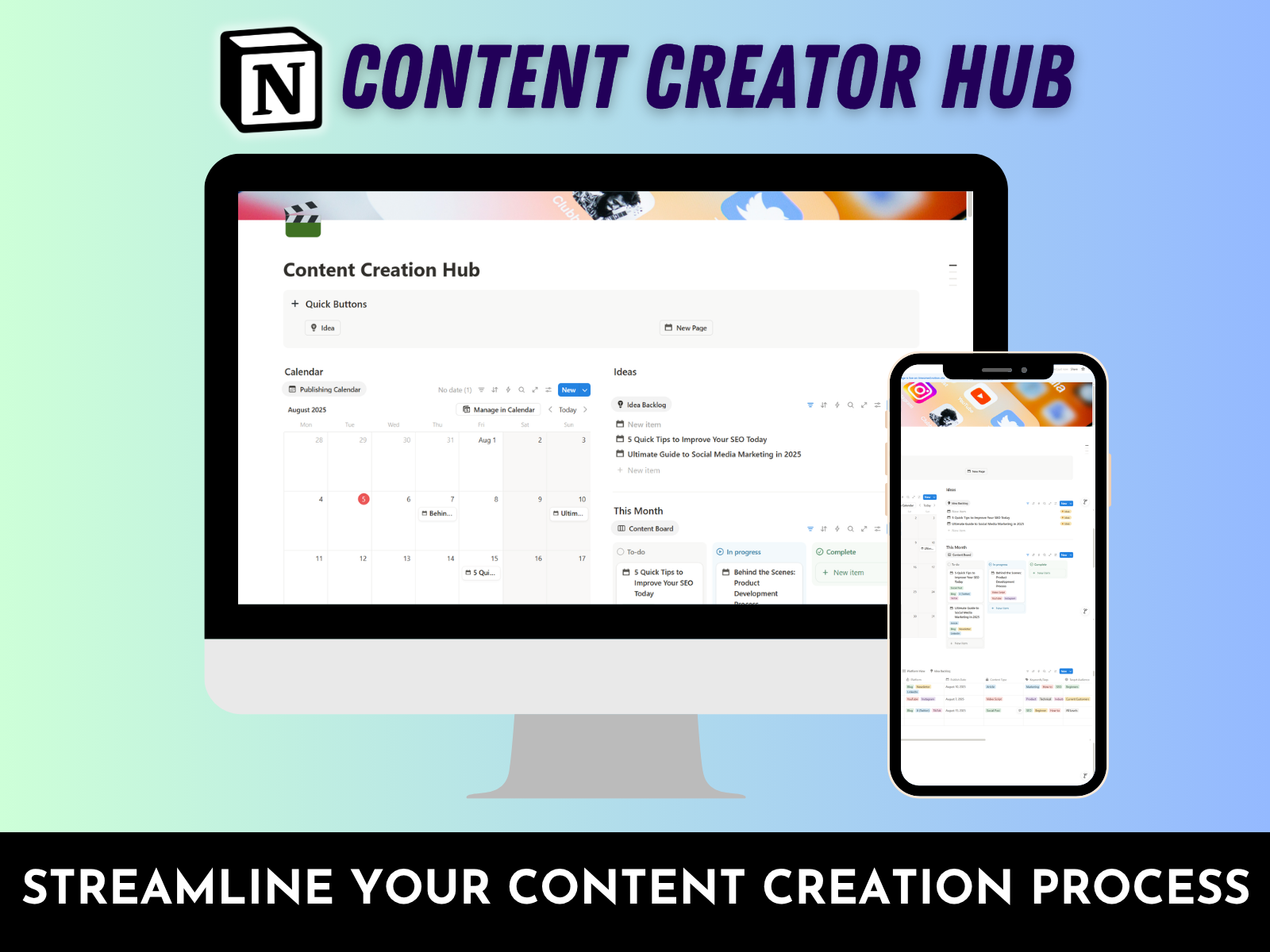 All-in-one content command center: Streamline planning, scheduling & execution across platforms. Manage ideas, calendars & workflows in Notion. Key features highlighted: ✅ Comprehensive tool ("All-in-one command center")✅ Core functions ("Planning, scheduling & execution")✅ Platform coverage ("Across platforms")✅ Key components ("Ideas, calendars & workflows")